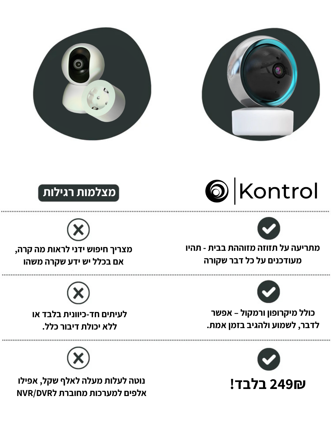 מספרים שחסכו אלפי שקלים על מערכות מצלמות מחווטות והתקנות מסובכות – המצלמת ™360 של Kontrol מגיעה מוכנה לשימוש, בלי קידוחים ובלי התקנות מורכבות, ופועלת ישירות מכל טלפון.